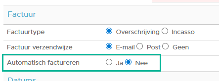 In het linkerdeel geef je ook aan wat de betaalwijze en verzendwijze wordt van de factuur. Indien je bij de verzendwijze kies voor ‘Geen’ dan wordt de factuur niet verzonden, maar deze wordt wel aangemaakt. Zet je automatisch factureren op ‘Ja’ dan worden er automatisch facturen gegenereerd.