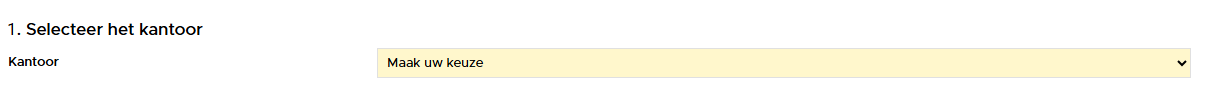 In dit scherm kan je het kantoor selecteren. Wanneer jij bent gekoppeld aan één kantoor dan wordt automatisch het kantoor ingevuld waaraan jij gekoppeld bent.