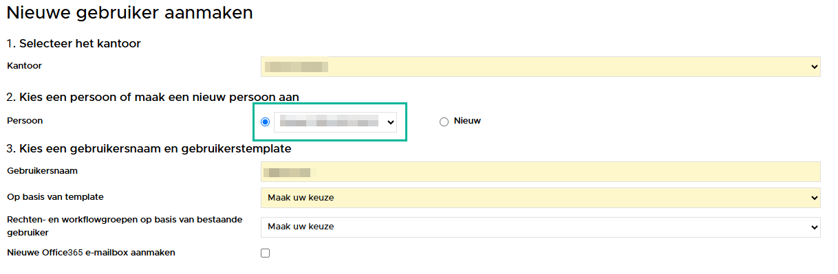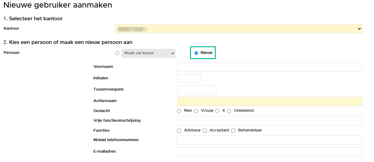 Wanneer de persoon waarvoor je het gebruikersaccount wilt aanmaken nog niet in het extranet staat dan kies je voor ‘Nieuw’. De velden die dan getoond worden, vul je in.