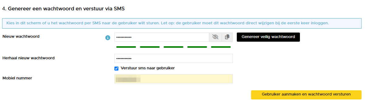 Tenslotte genereer je een wachtwoord door op de knop ‘Genereer veilig wachtwoord’ te klikken. Dit wachtwoord kan je kopiëren en per sms naar de gebruiker verzenden. Om het wachtwoord per sms te verzenden vink je ‘Verstuur sms naar gebruiker’ aan. Wanneer het mobiele nummer bekend is dan wordt deze automatisch gevuld anders moet je deze handmatig invullen.