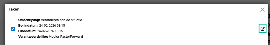 Voor deze taken staat een checkbox die standaard aangevinkt staat. Wil je niet dat er bepaalde taken aangemaakt worden dan kan je de checkbox ervoor uitvinken. Per taak kan je de naam, start- en einddatum, tijd en verantwoordelijke aanpassen. Om dit aan te passen klik je op het wijzigingsicoon achter de taak.