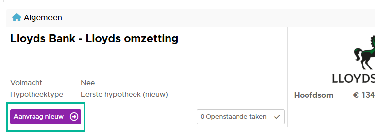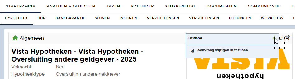 De intermediair stuurt de aanvraag naar jullie toe. Het kan gebeuren dat deze aanvraag niet helemaal klopt en dat je als serviceprovider deze graag zelf wilt aanpassen. Dit is mogelijk in Fastlane. Hiervoor ga je naar het hypotheekproduct en je klikt op het bliksemicoon en vervolgens op ‘Aanvraag wijzigen in Fastlane’.
