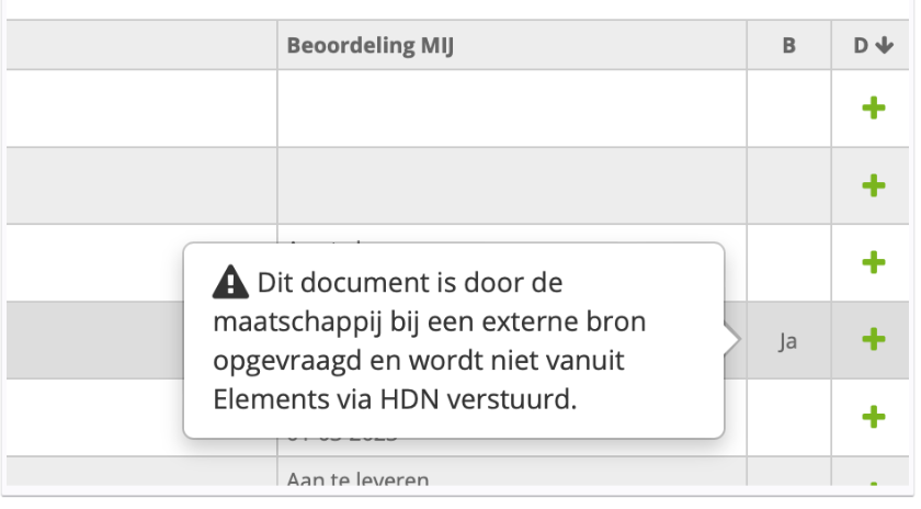 In de stukkenlijst staat ook de kolom ‘B’. In deze kolom is zichtbaar of de stukken door de maatschappij opgevraagd zijn via een andere bron. Als het stuk via een andere bron is opgevraagd dan staat er ‘Ja’ in de kolom. Dit is ter administratie, je kunt verder niets met dit stuk. Wanneer op dit stuk toch een DX bericht terugkomt dan wordt er automatisch een SX-bericht retour gestuurd met daarin de status ’07 Document reeds opgevraagd via bron’.