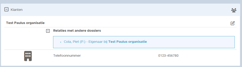 Is de klant gekoppeld aan een organisatie als bijvoorbeeld eigenaar of contactpersoon dan zie je hier ook die link terug. Achter de functienaam zit een bepaalde logica. In het het zakelijke dossier vind je onder ‘Relaties met andere dossiers’ ook de gekoppelde persoon terug.