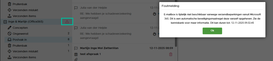 Het is niet mogelijk om e-mails op te halen in de e-mailbox die is geblokkeerd. Ook deze beperking wordt opgelegd door Microsoft 365. Wil je de e-mails handmatig ophalen bij een geblokkeerde mailbox dan verschijnt er de melding: ‘E-mailbox is tijdelijk niet beschikbaar vanwege verzendbeperkingen vanuit Microsoft 365. Dit is een automatische beveiligingsmaatregel, deze wordt vanzelf opgeheven’. Met daarbij de datum en tijd tot wanneer dit kan duren. Ook staat er een rode driehoek bij de betreffende mailbox.