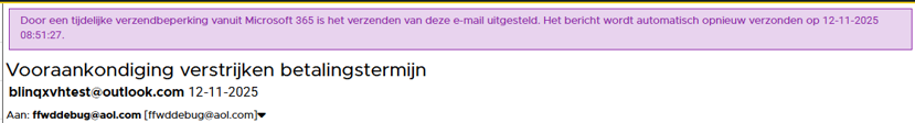 Als je de API-limieten hebt bereikt, bijvoorbeeld door e-mails in bulk te verzenden, dan wordt er een verzendbeperking op de e-mailbox gezet. De e-mails die nog verzonden moeten worden, worden dan in een wachtrij geplaatst om later alsnog automatisch verzonden te worden. Deze e-mails vind je terug in de map ‘Verzenden mislukt’ van de betreffende mailbox. Bij de e-mails staat een paarse melding, waarin wordt aangegeven dat door een tijdelijke verzendbeperking vanuit Microsoft 365 het verzenden van de e-mail is uitgesteld met daarbij een datum en tijd waarop de e-mail opnieuw wordt verzonden. Deze datum en tijd krijgen wij terug vanuit de API van Microsoft. Krijgen wij de datum en tijd niet terug dan geven we een verwachte datum en tijd. Op dat verwachte moment gaan we opnieuw proberen de e-mail te versturen. Is de mailbox nog steeds geblokkeerd dan komt er een andere tijd en wellicht datum te staan. Deze melding is zowel zichtbaar in de e-mailmodule als in het dossier – tabblad Communicatie – E-mail.