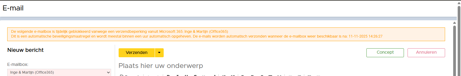 Vanuit de geblokkeerde mailbox is het nog steeds mogelijk om e-mails op te stellen en te versturen. Maar let op: deze e-mails komen óók in de wachtrij te staan. Deze worden niet direct verstuurd. Pas als de verzendbeperking is opgeheven. Dit wordt tijdens het opstellen van de e-mail ook aangegeven door middel van een melding.