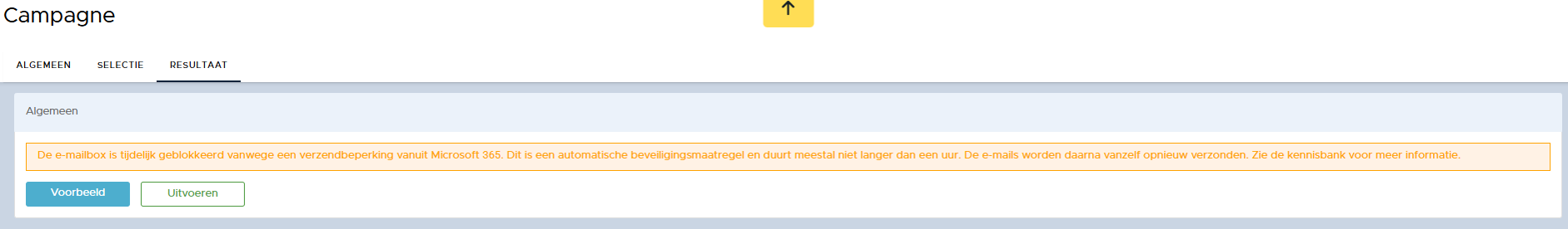 Ook in de campagnemanager wordt onder het tabblad Resultaat aangegeven als de e-mailbox tijdelijk is geblokkeerd. Zo is het duidelijk dat de e-mails vanuit de campagne niet direct worden verstuurd.